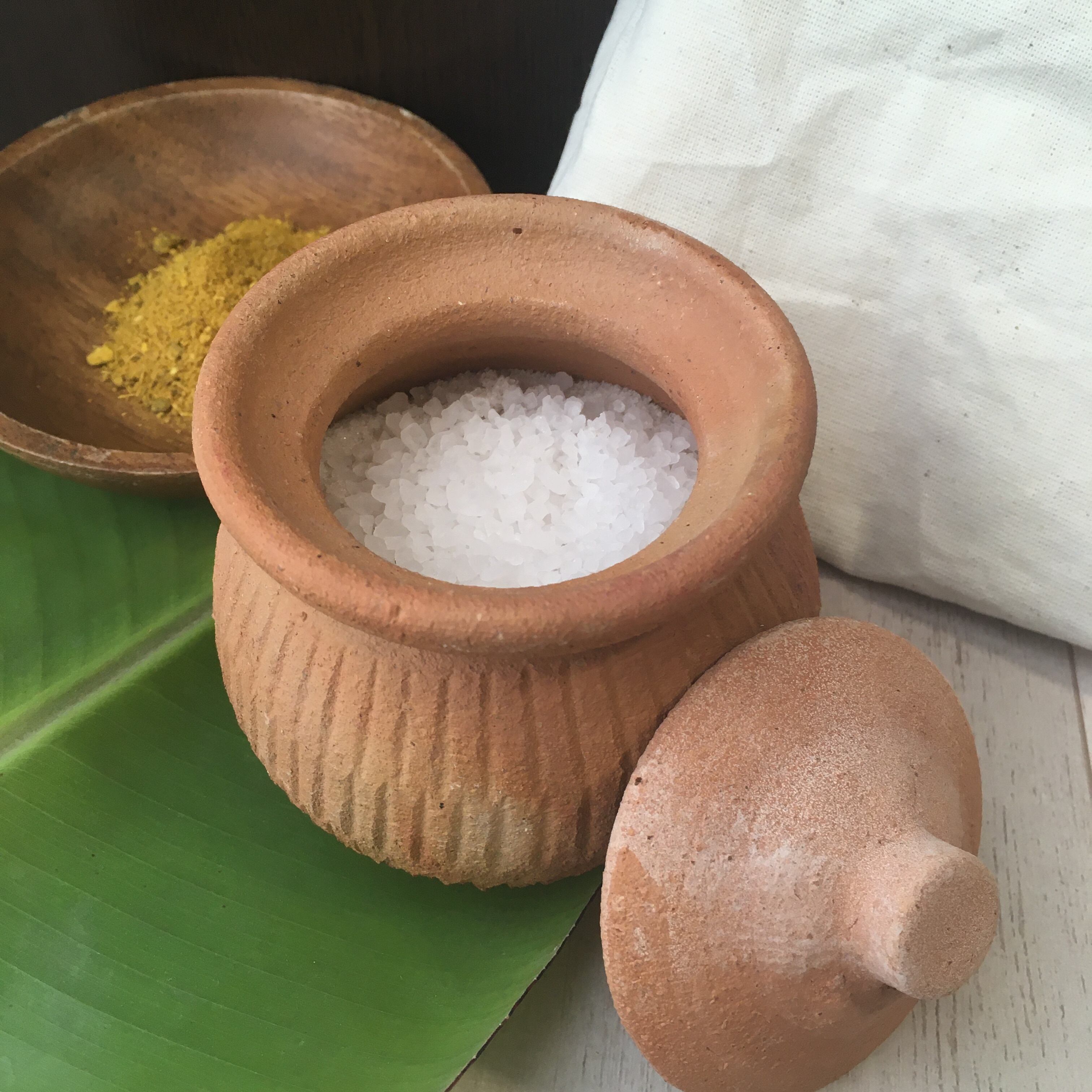 海塩を壺の中に入れて温めたものとハーブを布で包み、