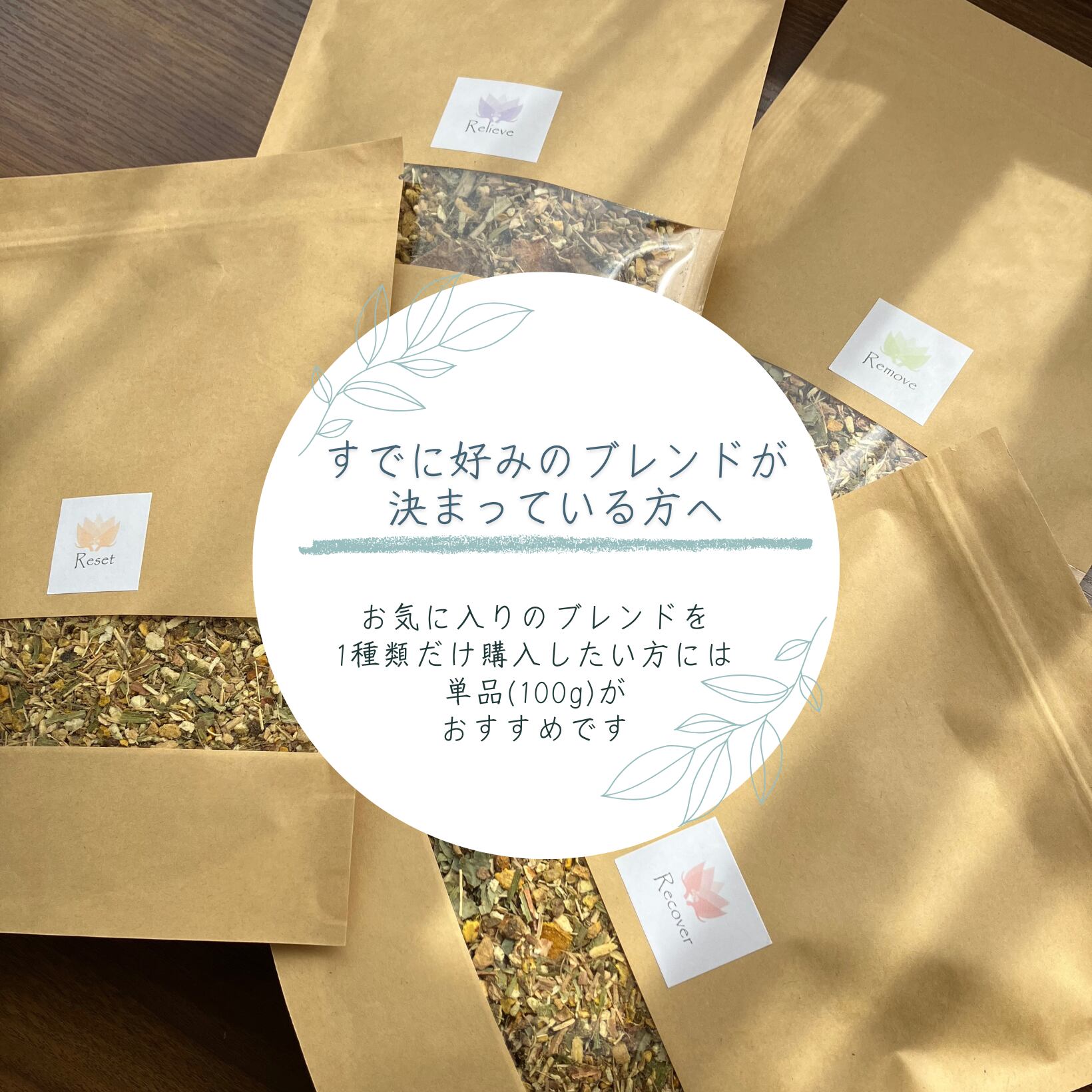 ・それぞれのブレンドに配合しているハーブは、シールに記載しております。ただハーブの効能はお付けしておりません。必要な場合にはオプションメからニューカードをお選びください。