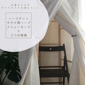 二重構造のハーブテント、サウナ用ハーブ4種類、ハーブの効能がわかる「メニューカード」が一度にそろうお得なセットです。